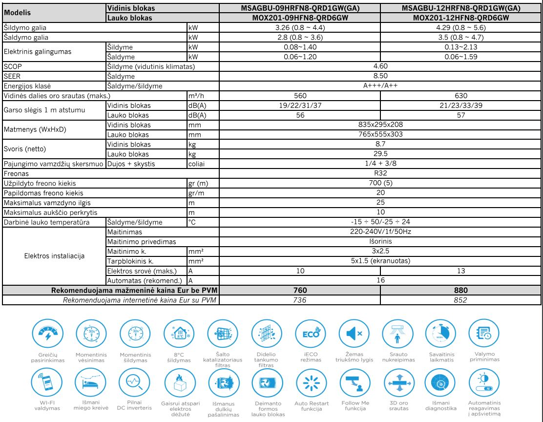 Midea Xtreme Save Eco yra modernūs sieniniai split tipo šilumos siurbliai, skirti efektyviam patalpų šildymui ir vėsinimui, užtikrinant komfortą ištisus metus. Šie įrenginiai išsiskiria inovatyvia inverterine technologija, kuri leidžia optimaliai reguliuoti kompresoriaus darbą pagal esamas sąlygas, taip sumažinant energijos suvartojimą ir užtikrinant ilgalaikį įrenginio patvarumą. Dėl kompaktiško dizaino ir pažangių technologijų jie ne tik taupo vietą, bet ir veikia itin tyliai, todėl puikiai tinka tiek gyvenamosioms, tiek komercinėms patalpoms. Be to, Midea Xtreme Save Eco serija pasižymi aukštu energijos vartojimo efektyvumu, padedančiu mažinti sąnaudas tiek vėsinimo, tiek šildymo režimu, o naudojamas ekologiškas R32 šaltnešis dar labiau sumažina neigiamą poveikį aplinkai.